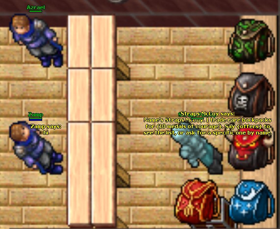 Straps McCoy NPC is now available in Thais (above Frodo's tavern) where you can trade 10x medal's of courage for new backpacks with larger capacity. Medals are obtained from the daily task. Verdant Ranger Backpack (Vol:26) Grim Reliquary Backpack (Vol:26) Demonhorn Warpack (Vol:26) Moonweave Satchel (Vol:26) Emberflare Pack (Vol:26)